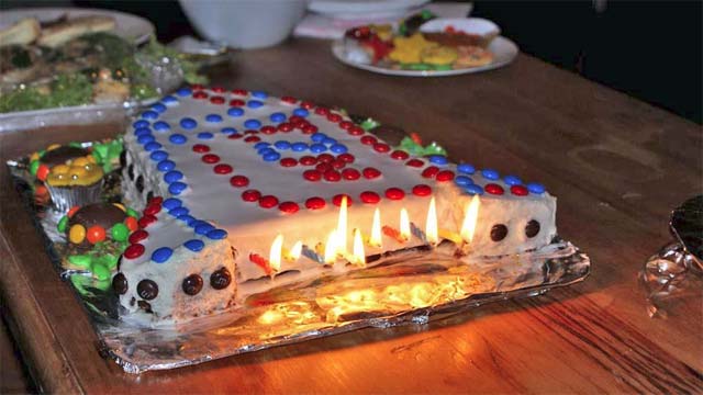 Here’s the cake with the obligatory candles. It wasn’t anyone’s birthday, but we just had to light it! Those are M & Ms on the cake.