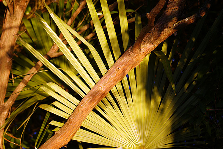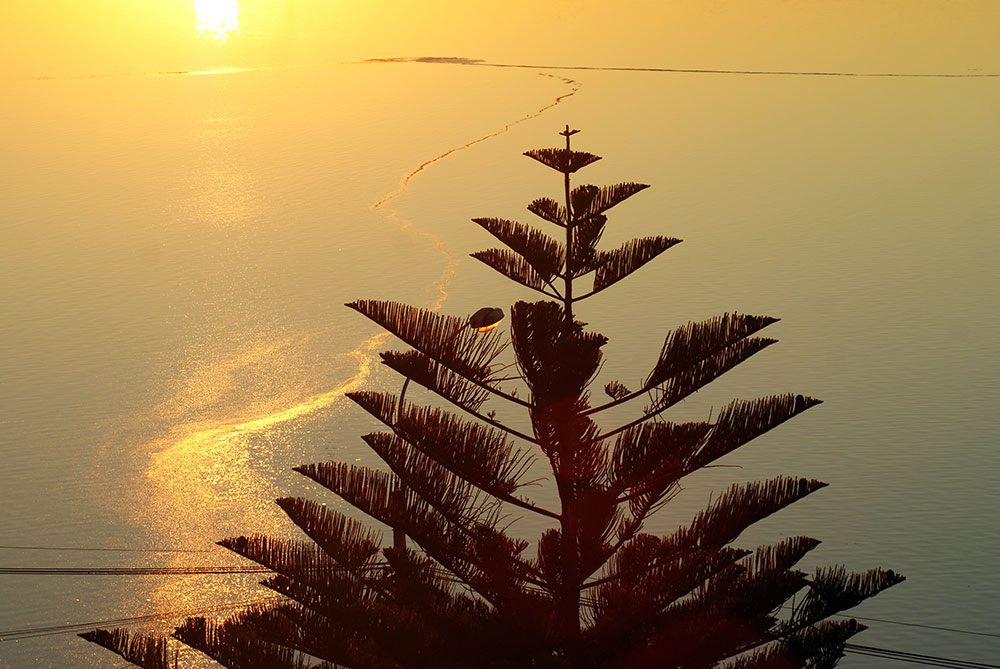 A Norfolk pine with the setting sun leaving a golden glow on the water.
