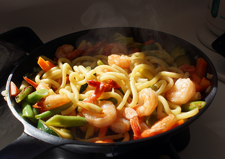 Lately, I’ve been trying to eat less red meat, so I’ve been eating more seafood and fish. One of my new favourite meals is super simple, quick, delicious and probably reasonably healthy (depends on what your opinion of noodles is). I decided to blog the meal so I could come back when I get stuck for ideas – as I often find I go through a stage of cooking the same things, then transition into another set of meals, then forget what I used to cook. So this is being filed under Meal Ideas for the benefit of me and for anyone who should be Google this as a recipe.