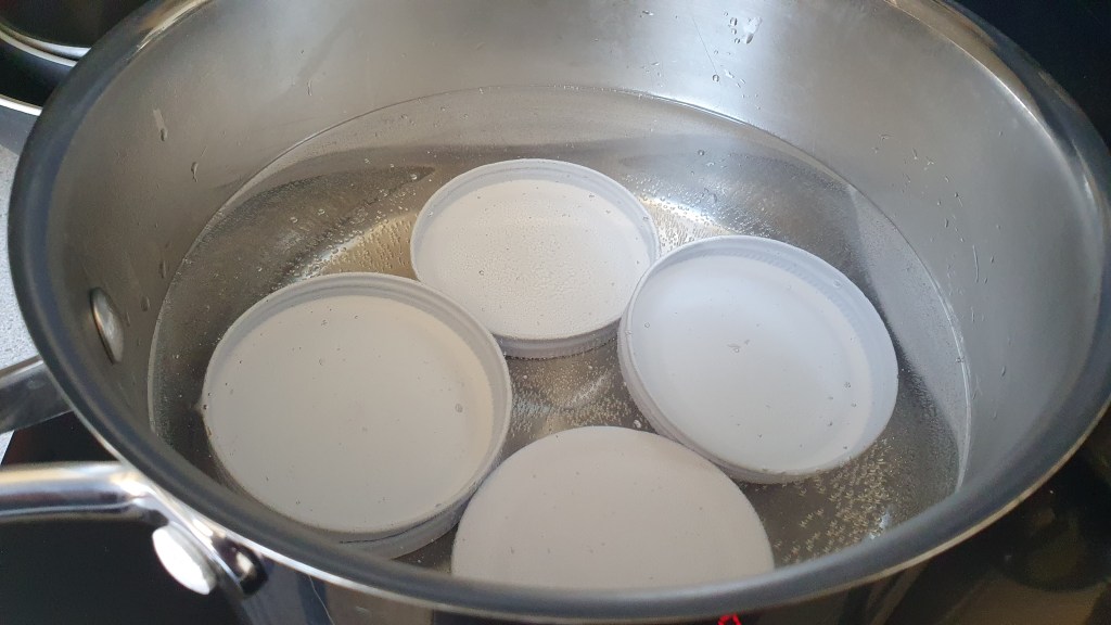 Sterilisation – I use the oven method – the jars are washed first in the dishwasher and then sit in an oven set to 120 degrees celsius for 30 minutes. The jar lids are boiled in water for 5 minutes.